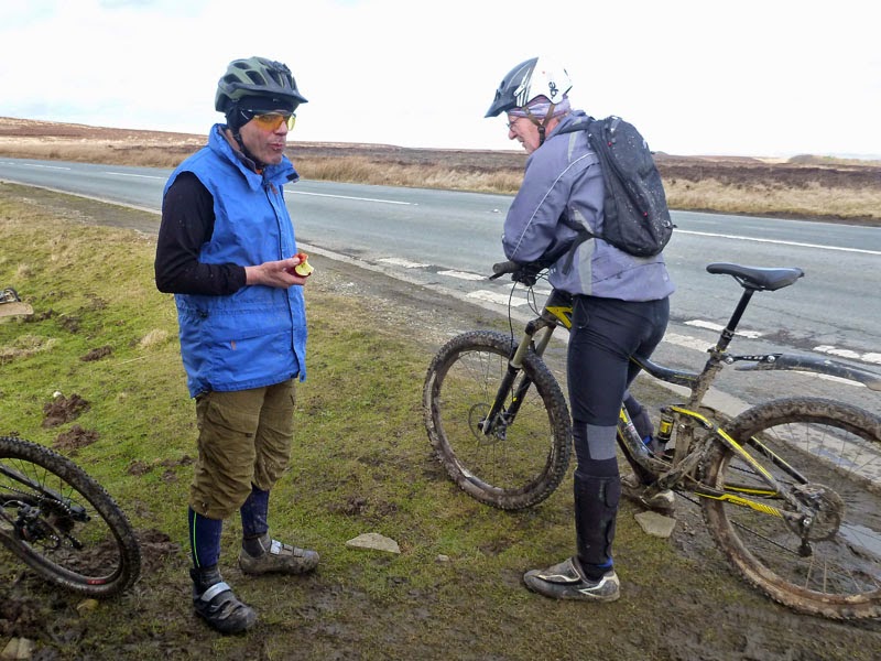 The idea was to slog up The Mad Mile from Square Corner, pedal along The Drove Road, drop down to enter Boltby Woods at Windygill Ridge and pick up the resurfaced track across Cowesby Moor down to Brickshed Cottage which is a section of the new Red Route from Sutton Bank. The Mad Mile is as gruelling as ever but now entirely rideable thanks(?) to the sanitisation of the trail, it was much more fun to ride down when the rocky slabs were still present. The Drove Road bore the odd puddle and muddy stretch, it was only when we turned off and headed towards Boltby Forest that things became a bit sketchy and a lot less fun than they ought to have been. The Pensioner doing a Superman into the heather at one point would have been the highlight of the ride - if we had actually saw him do it. All the way to Brickshed Cottage the trail teased us with flashes of dry, compacted earth, seducing us along, only to turn to squelch. The final section which goes steeply down to join the road at Brickshed Cottage had no saving graces, pure filth from top to bottom, deep mud interspersed with rocks, like badly cooked dhal, passengers on our bikes we dabbed and slithered and jolted our way down to the sanctuary of tarmac.