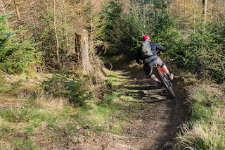 We spent a pleasant hour or so, sessioning sections and watching The Youth finding his air time mojo, The Breadlad found his falling down the hill mojo when his front wheel slipped while descending a rock garden, it wasn’t all bad news - I did manage to film and photograph it. Leaving the downhill track behind, we continued down to Over Silton and went back into the woods in search of vaguely remembered tracks around the Hanging Stone area, overlooking Thimbleby.